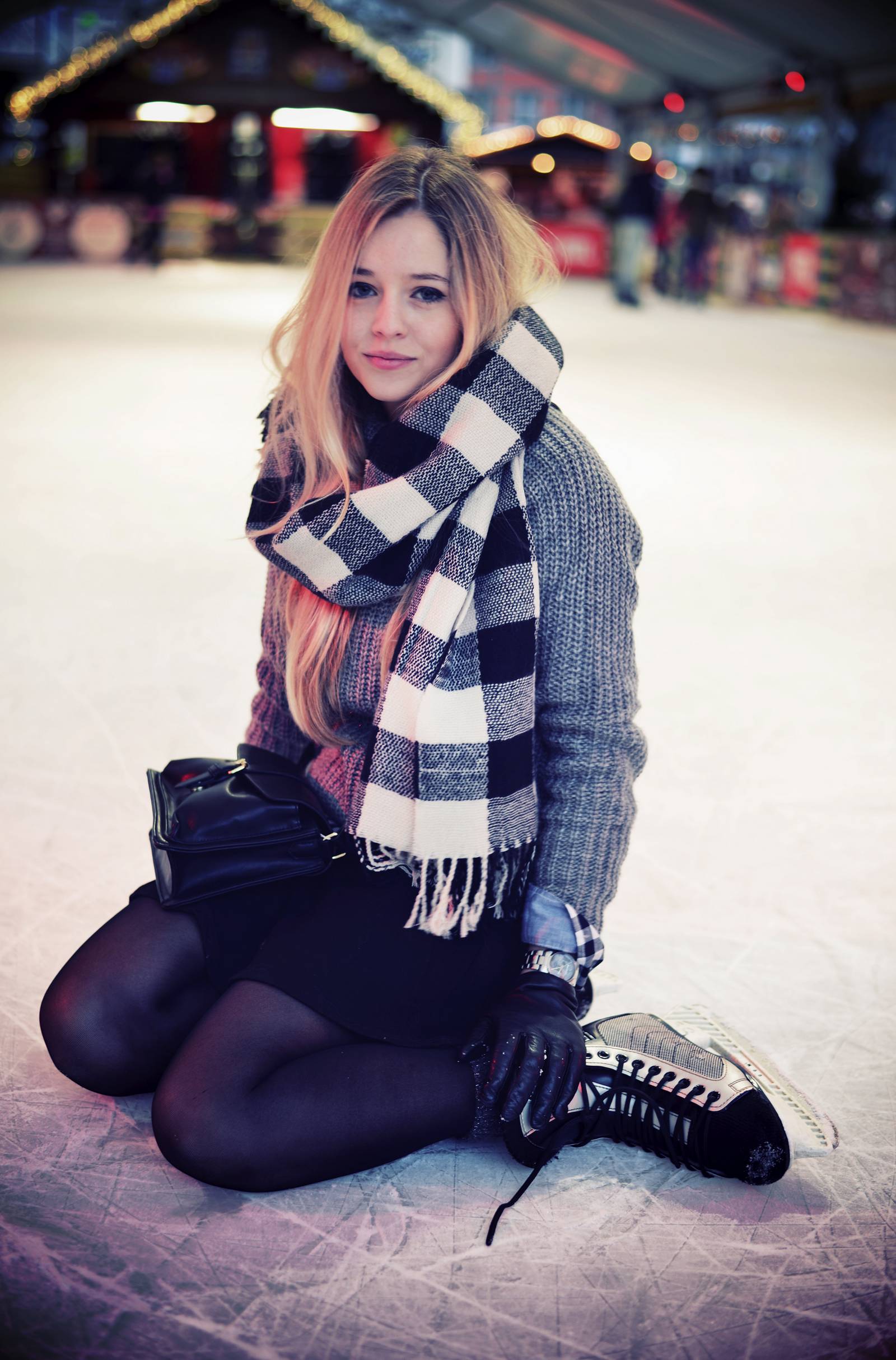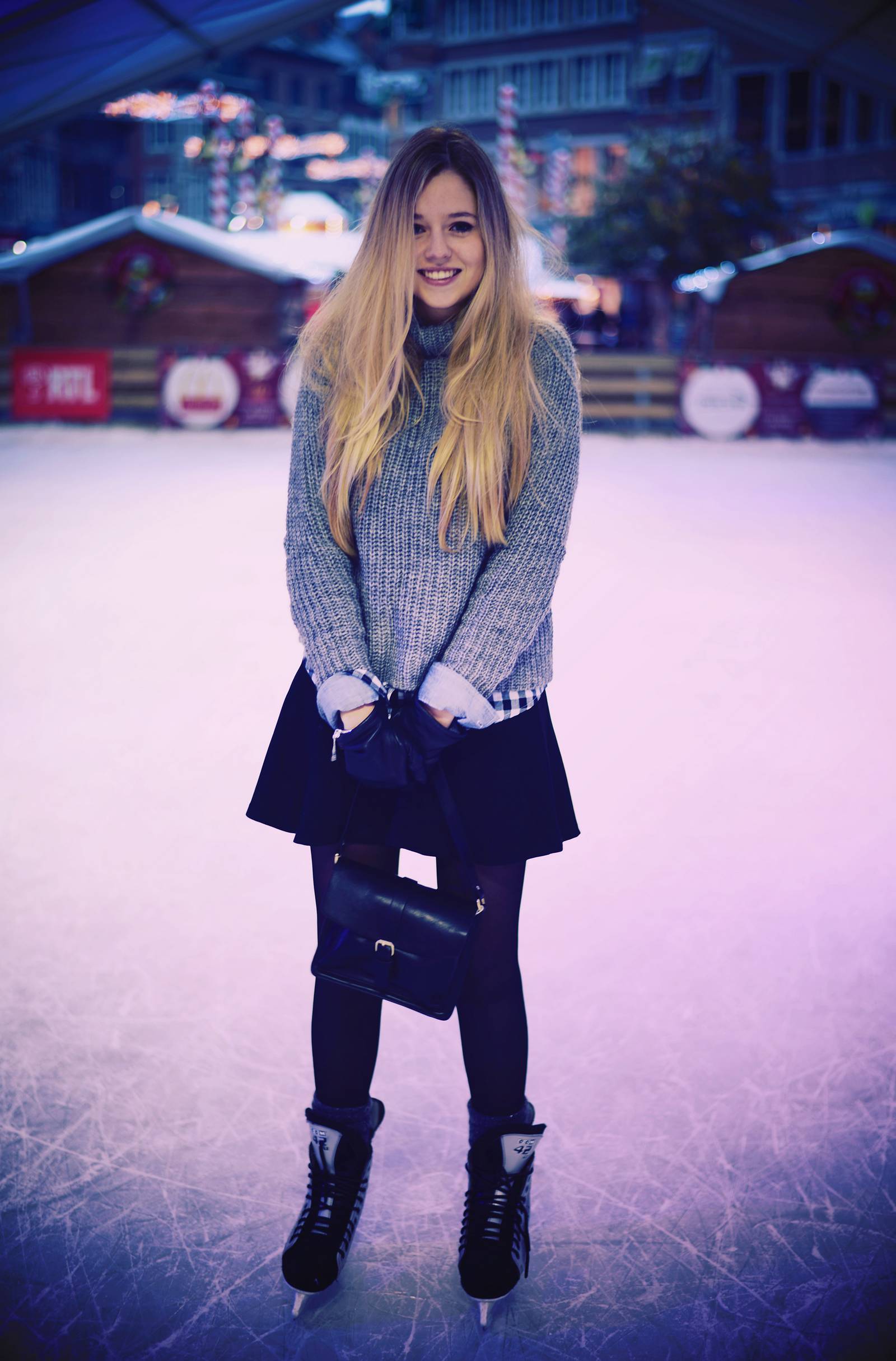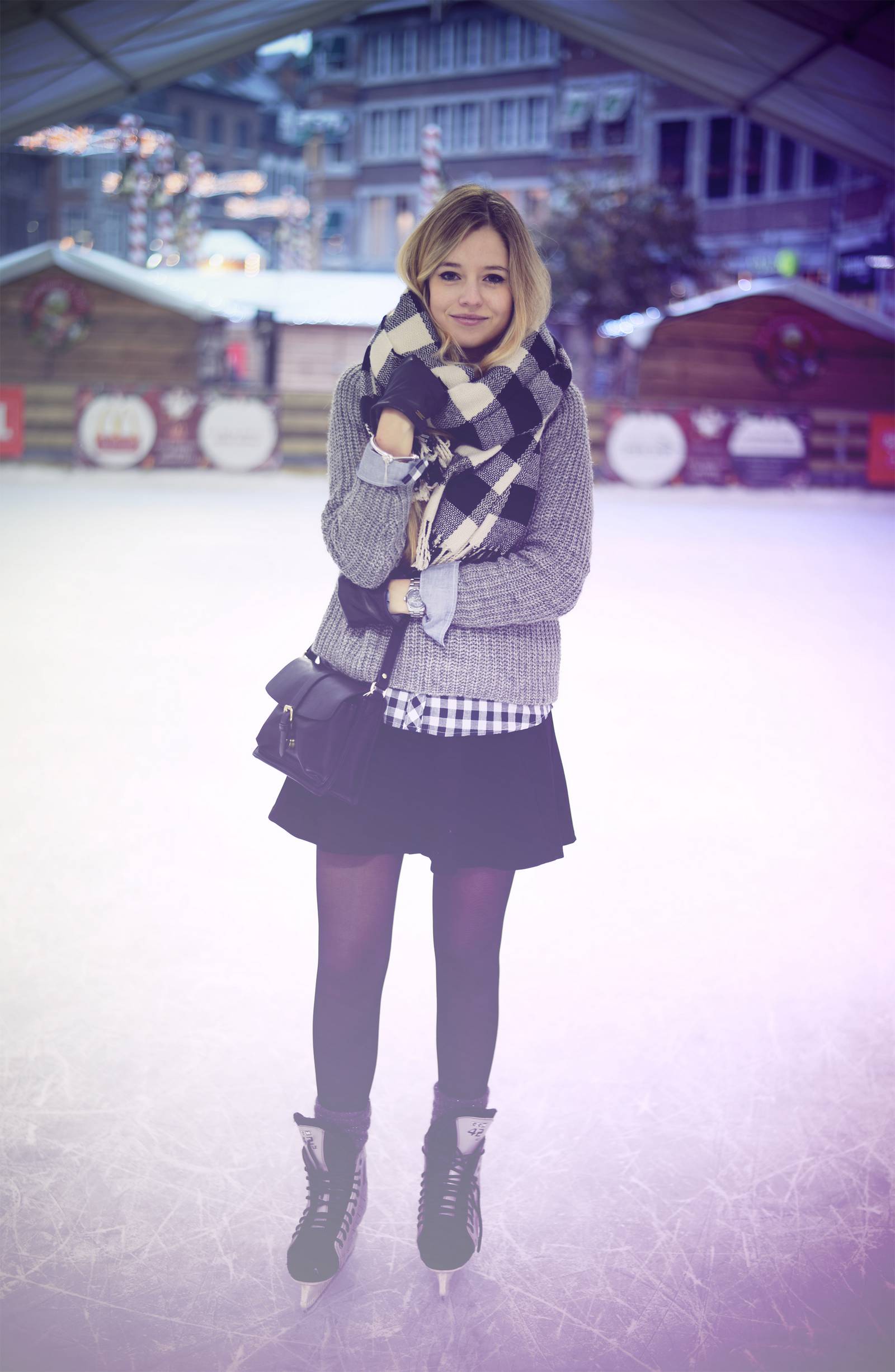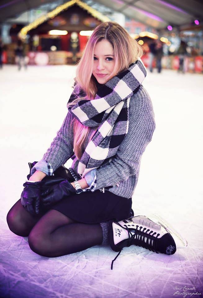 J'ai choisi de faire cette série de photo sur la patinoire, pour ressentir cette atmosphère des fêtes de fin d'années. J'adore patiner, mais le faire avec des patins pas adaptés, en jupe et en posant … Ce fut une vraie partie de fous rires avec ma photographe (heureusement elle n'a pas été obligée d'enfiler des patins sinon je ne pense pas que l'appareil photo en serait sorti entier haha). Pour courroner le tout, c'était le premier jour de "vrai" froid, donc sans veste c'était un peu limite (et puis j'ai eu la bonne idée de m'assoir sur la patinoire … en jupe! Si j'ai un rhume des fesses je saurais pourquoi). Et le mieux du mieux, quelques heures après être rentrées chez nous, les premiers flocons sont tombés ! Je vous avoue que j'aurais préférés qu'ils tombent 3 heures plutot, histoire d'avoir encore des photos plus canons mais on ne peut pas tout avoir malheureusement!