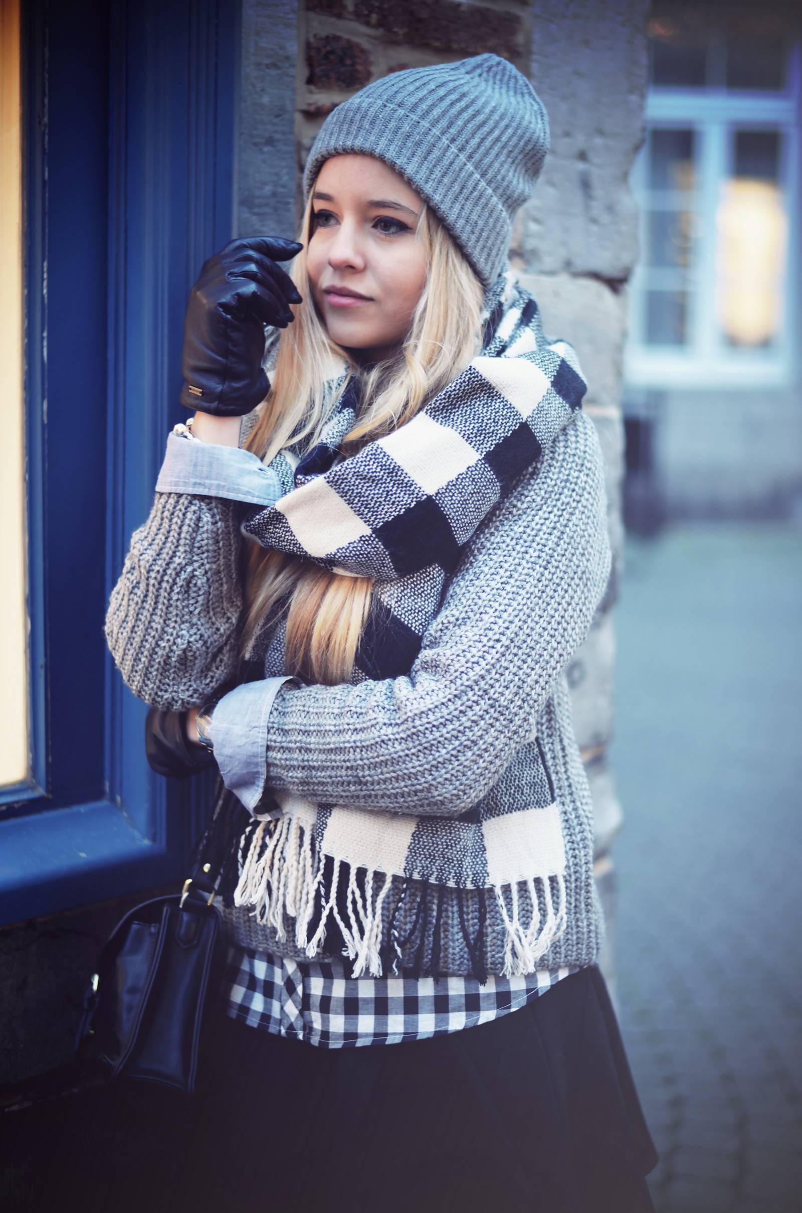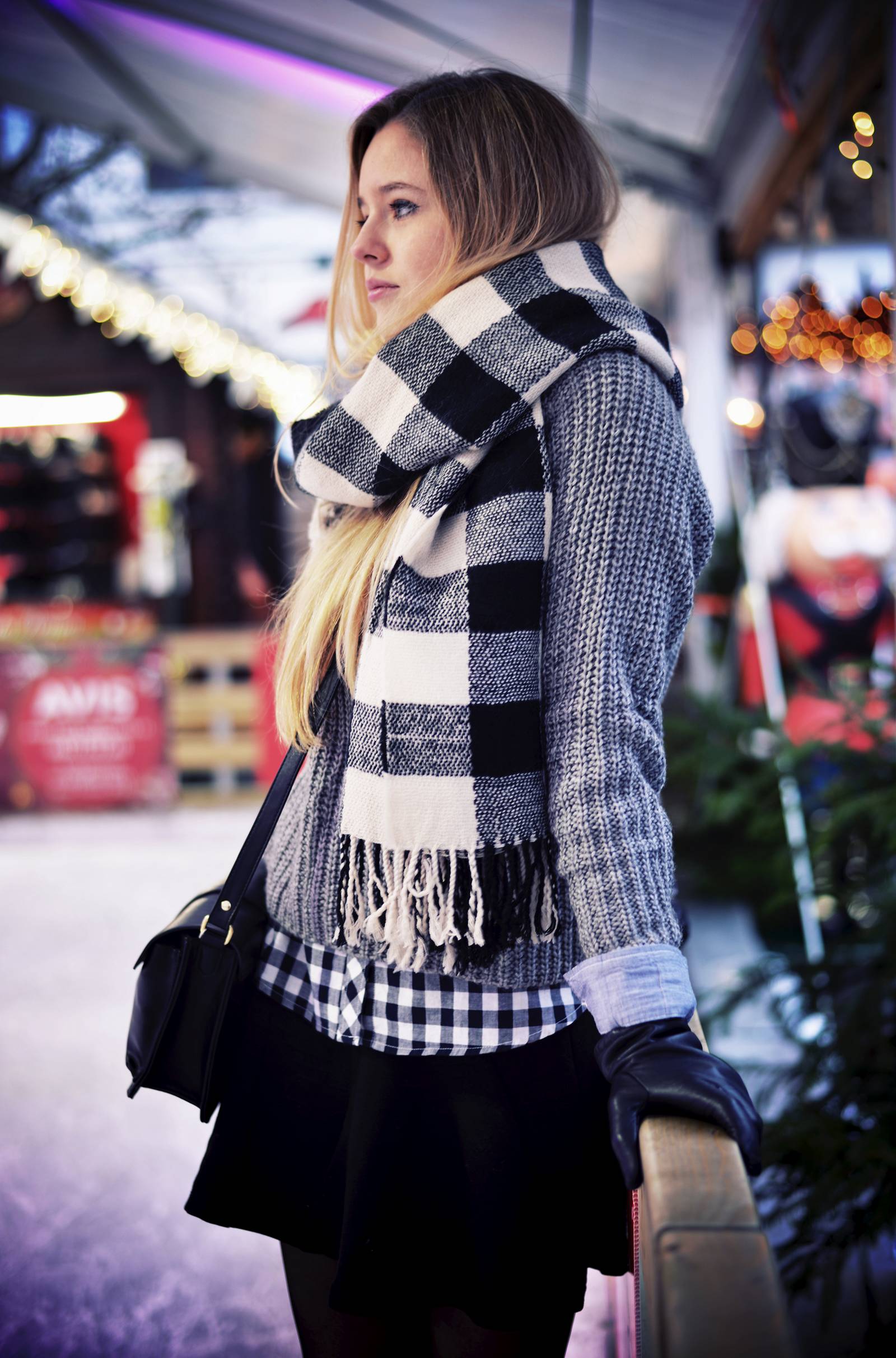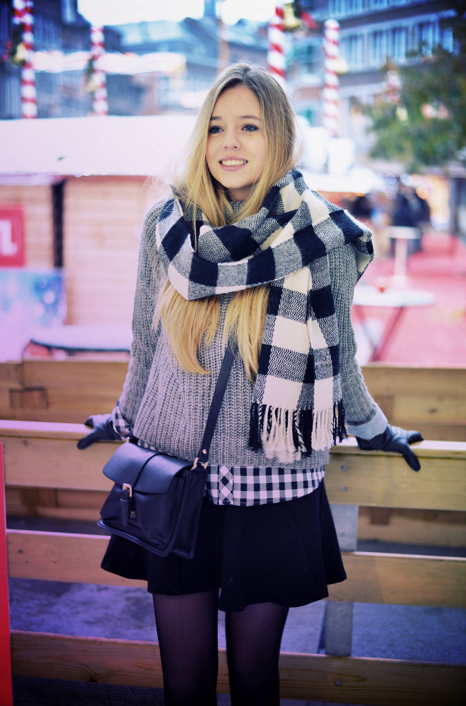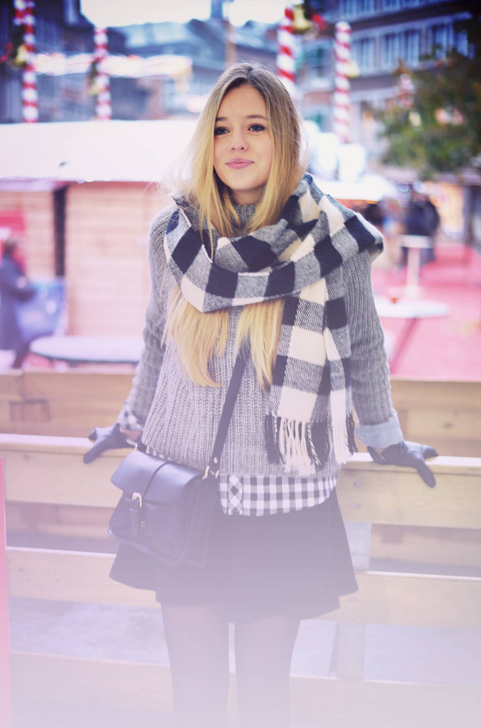For this outfit, I chose to wear my black skirt. It’s really a great piece ! I’m wearing it with a vichy kind of shirt, black and white, and a grey turtle neck. Keep in mind that you should order maybe a size bigger than what you usually wear for the Springfield clothes ! To finish off the look, I paired it with a wonderful black and white scarf, and a little school bag.