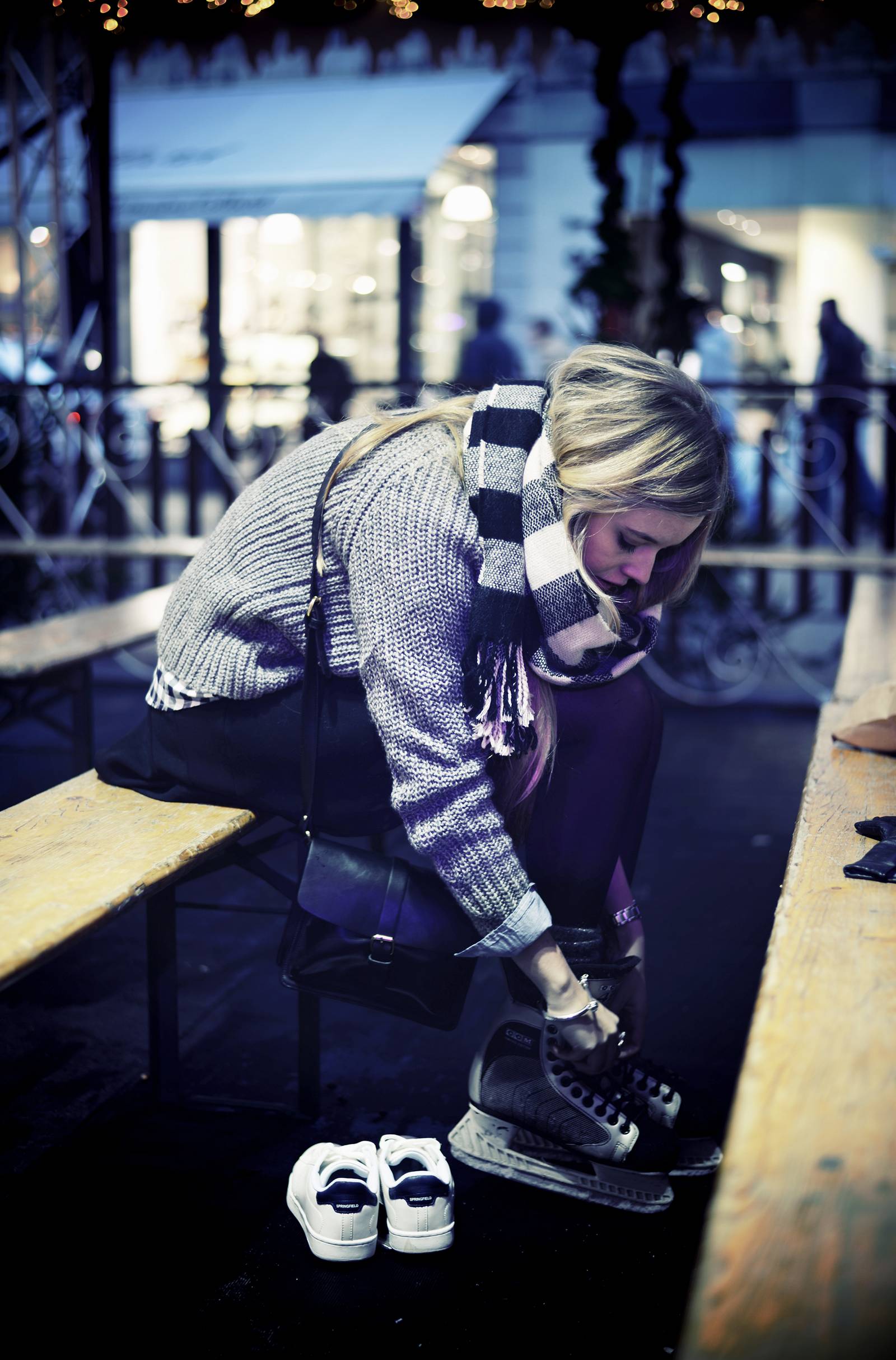 I choose to do the pictures on the ice to feel the Christmas atmosphere. I love doing ice skating, but it was a bit cold with that outfit, and plus I had the brilliant idea to seat on the ice with my skirt ! I’m gonna catch a bum flue I’m sure … And a few hours later, some snow was falling ! I wish I could have that on my photos, but.. Another time !